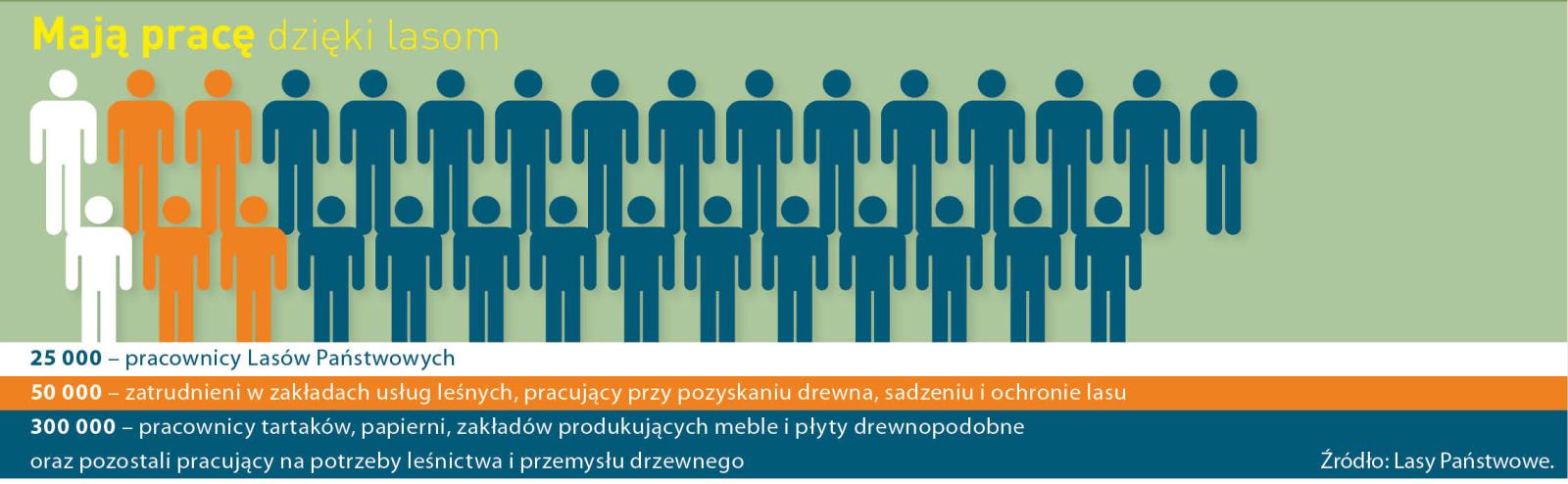 Die Staatsforste gehören zu den führenden Arbeitgebern in Polen. Wald und Holz sichern allerdings auch den Unterhalt für ein paar Tausend Mitarbeiter privater Forstbetriebe, die im Auftrag des Staatsforstbetriebes u.a. Aufforstung, Pflegearbeiten, Holzernte und Holzabtransport übernehmen. Vor allem gibt aber der Wald Beschäftigung für Mitarbeiter unzähliger Firmen in der Holz-, Möbel- und Papierindustrie tätig sind. Insgesamt sind es bis 375 Tausend Polen. Statistisch gesehen arbeitet jeder hundertste Einwohner unseres Landes in der Forstwirtschaft bzw. Holzindustrie.
